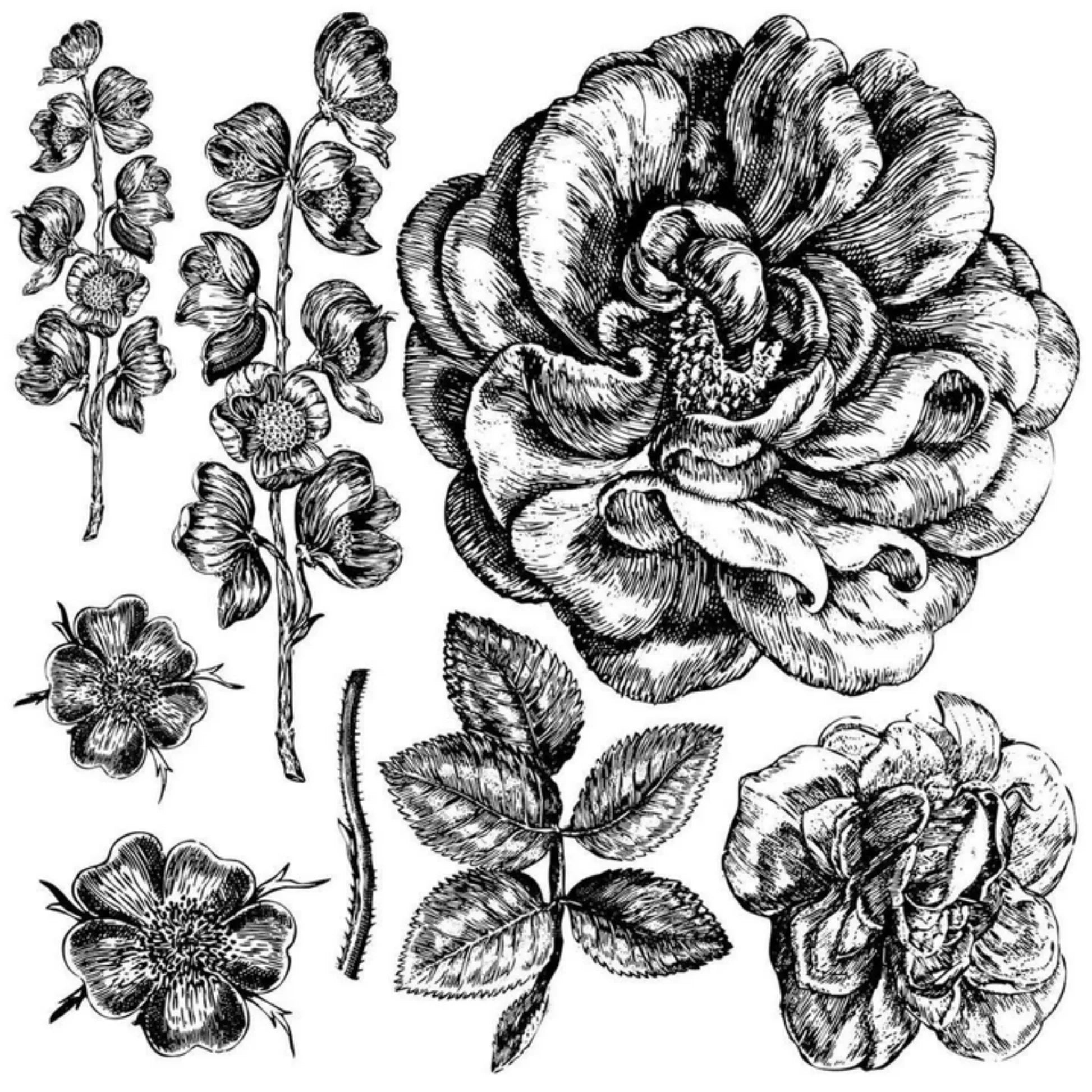 The stamp set includes multiple designs on two 12x12 inch sheets and comes with reusable masks for creating layered effects and depth in stamped designs.